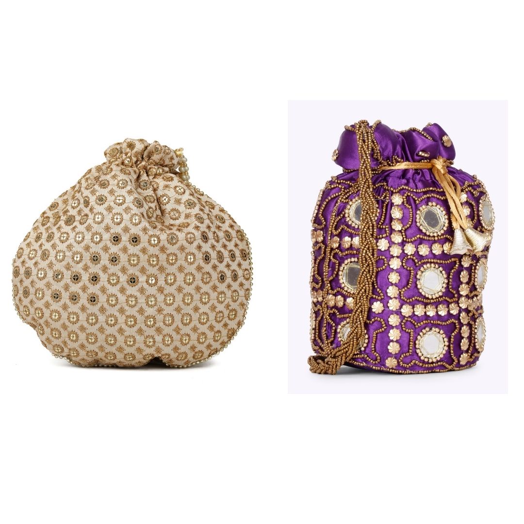 Combo – Designer Embroidered Potli Bag – Golden & Purple
